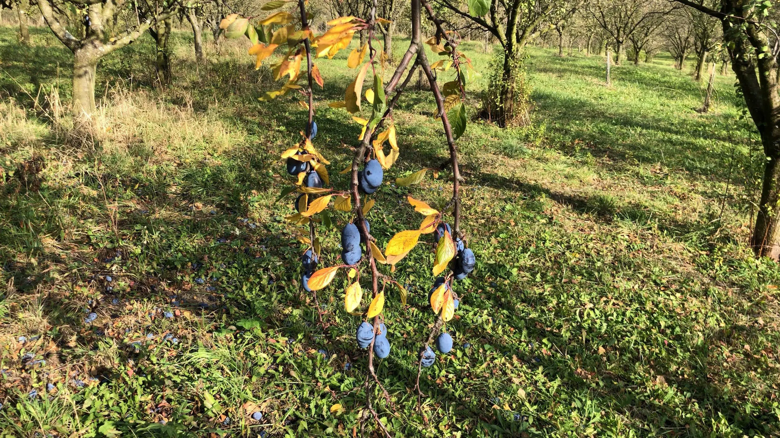 Sbíráme v podstatě rozinky. Voda je pryč, zbyla dužina plná cukru. Veškerý říjnový sběr dáváme do zvláštní kvasné nádrže, kterou vydestilujeme až naposledy někdy v květnu příštího roku. Bude z toho náš pozdní sběr. Výběr ze švestek. Výběr z kýblů…