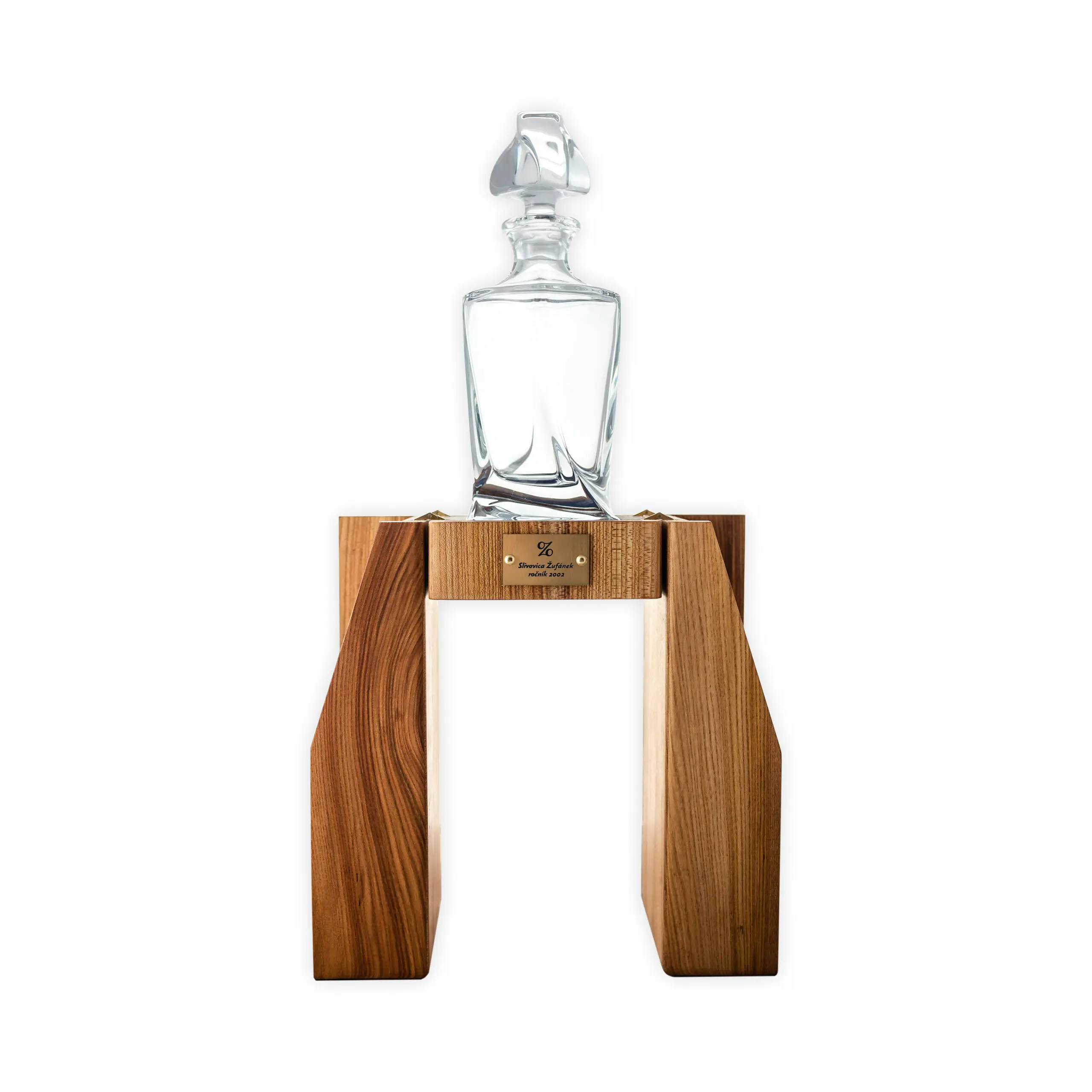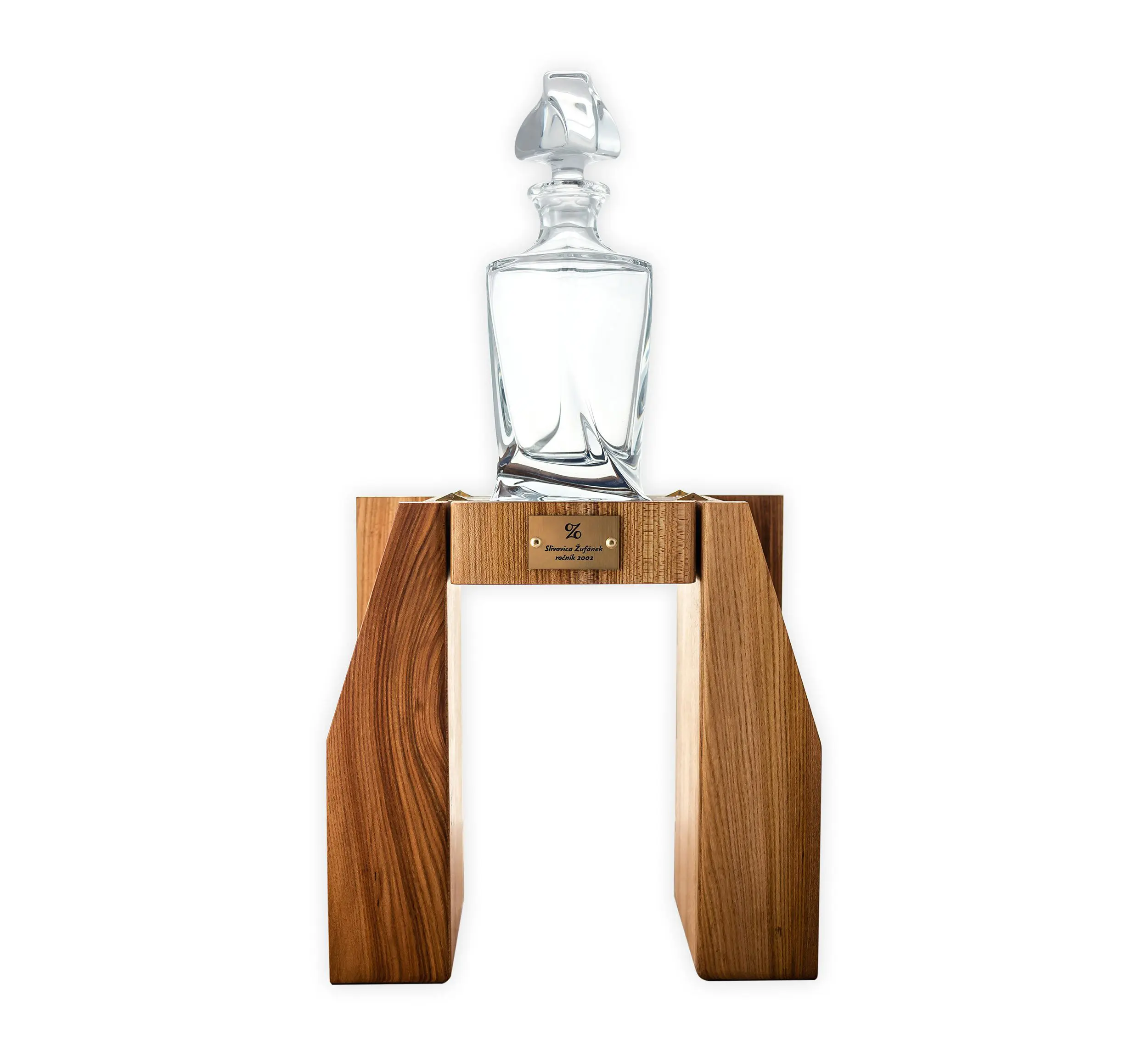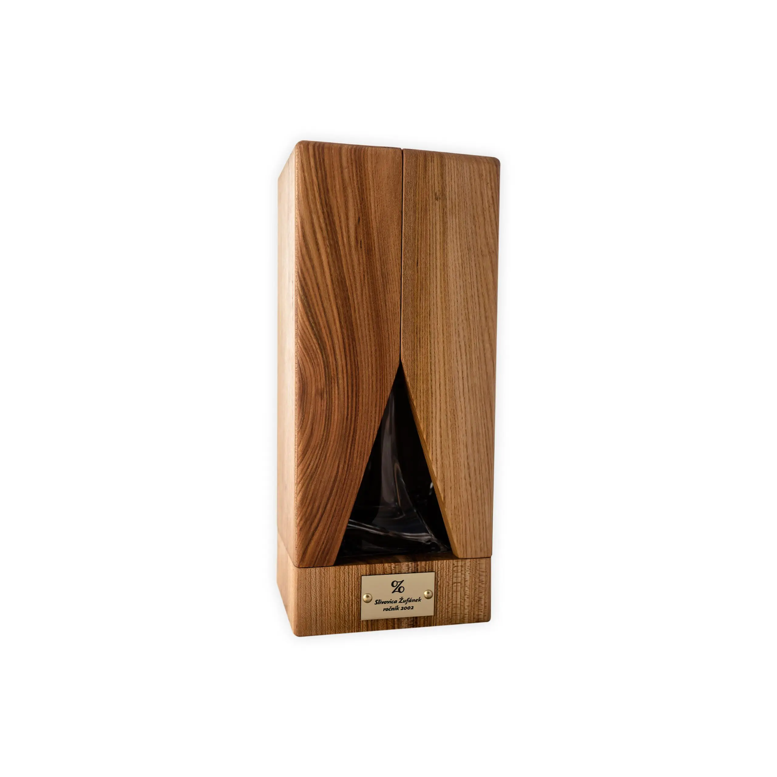 We’ve been working on the packaging for this rare spirit since January. The bottle is a luxurious crystal decanter made by Crystalite Bohemia. It belongs to the same series as the glasses we’ve been adding to our gift packages. Each bottle comes in a box made from elm wood and you can open it like a fan, or turn it around and use it as a stand. Each box is made manually and meticulously, and we can only manufacture 10 of them a week. They were devised, designed and draughted by our mother, Marcela Žufánková.